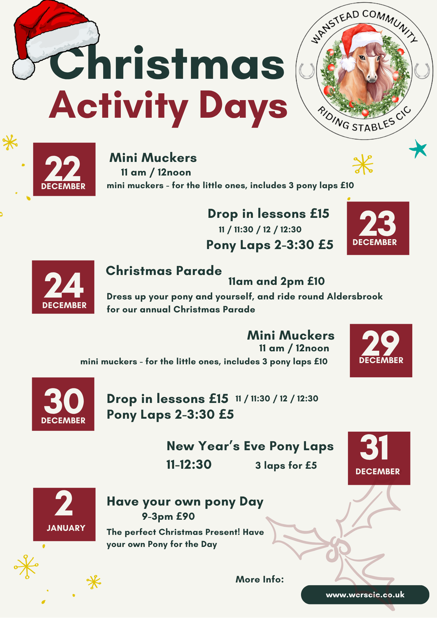 From pony laps, drop in lessons, Have your own pony day, our annual christmas Parade; we've got everything covered to keep the kids (and adults) occupied during the festive season! We even hear Santa might be making an appearance.....